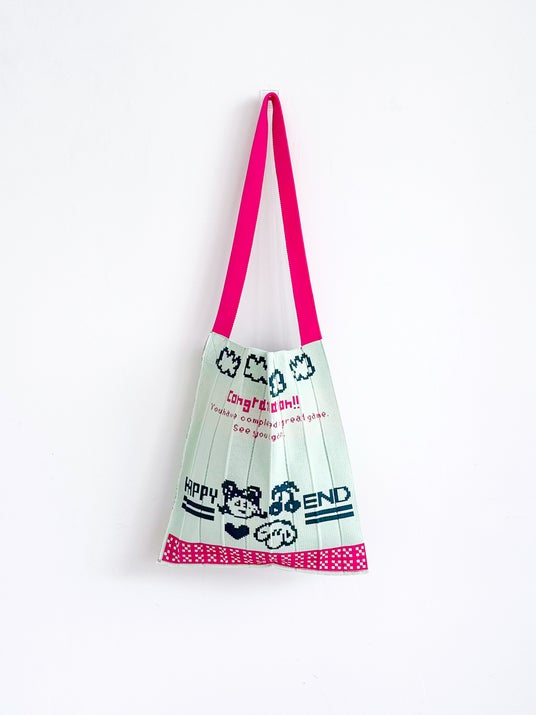 鮮やかなピンクのショルダーのカラーが目を惹く配色に、ゲームをクリアした際に出てくる「HAPPY END」の柄が可愛らしいデザインです。