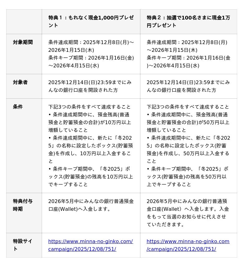 2025年12月8日から2026年1月15日までの期間(条件達成期間)中に、1.みんなの銀行預金残高(普通預金と貯蓄預金の合計)を10万円以上増やし、かつ、2.新たに「冬2025」の名称のボックス(貯蓄預金)を作成して10万円以上を入金した方で、3.2026年1月15日から2026年4月15日までの期間(条件キープ期間)中、「冬2025」ボックスの残高を10万円以上キープしていただいた方に、もれなく現金1,000円をプレゼントします。