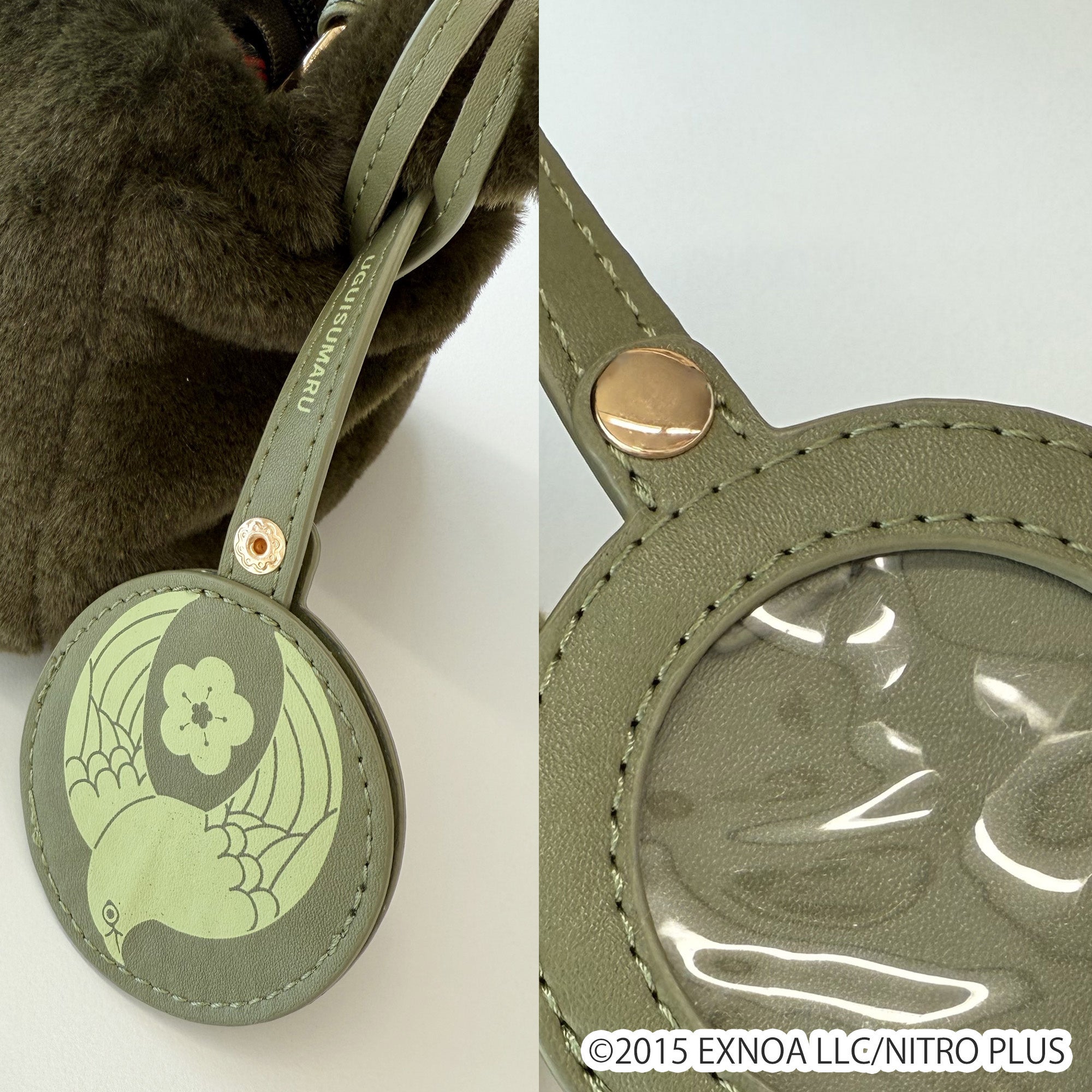 鶯丸をイメージした深い緑色を基調としたバッグです。鶯丸の刀帳番号である「55」「UGUISUMARU」のネームタグがポイント。