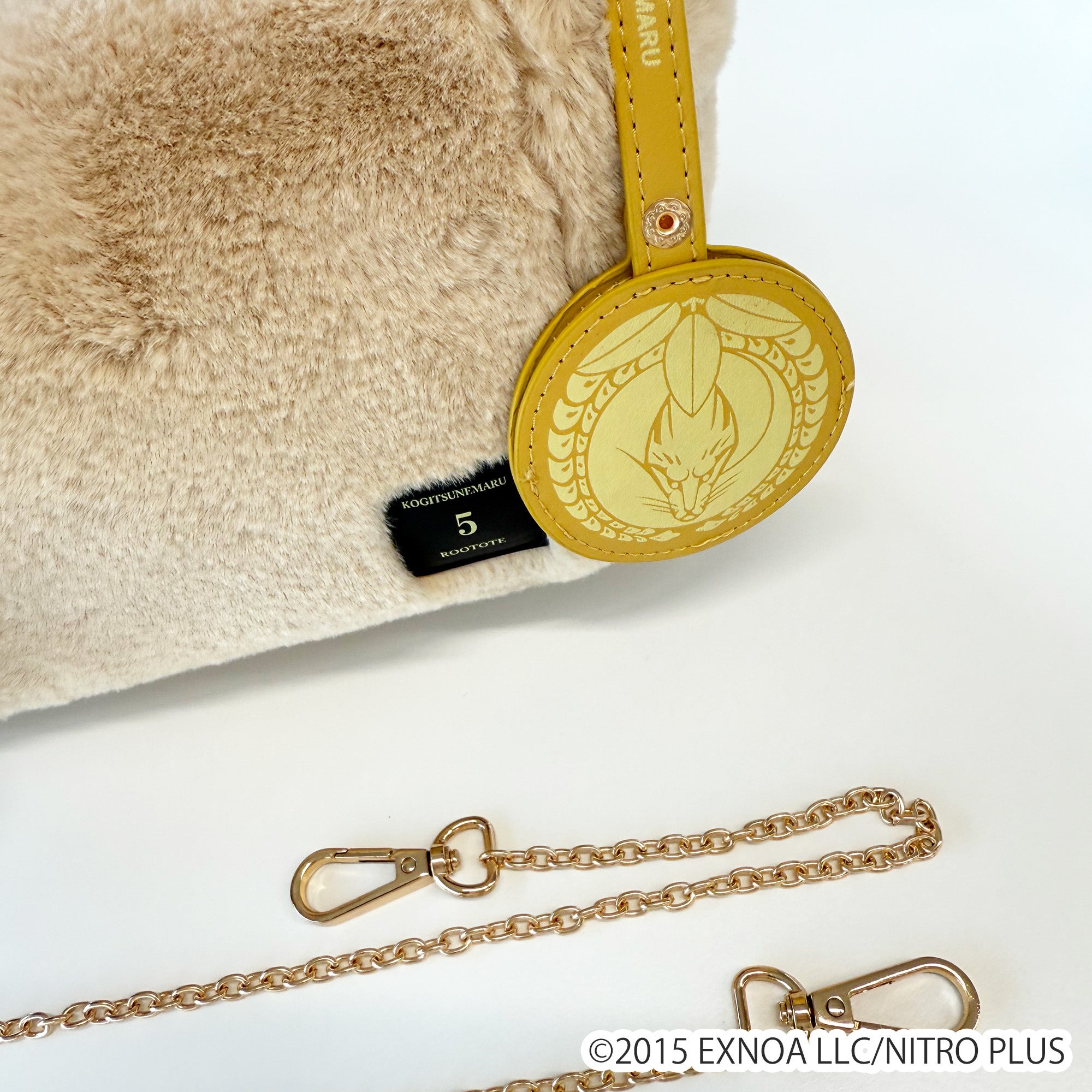 小狐丸をイメージした黄金色を基調としたバッグです。小狐丸の刀帳番号である「5」「KOGITSUNEMARU」のネームタグがポイント。
