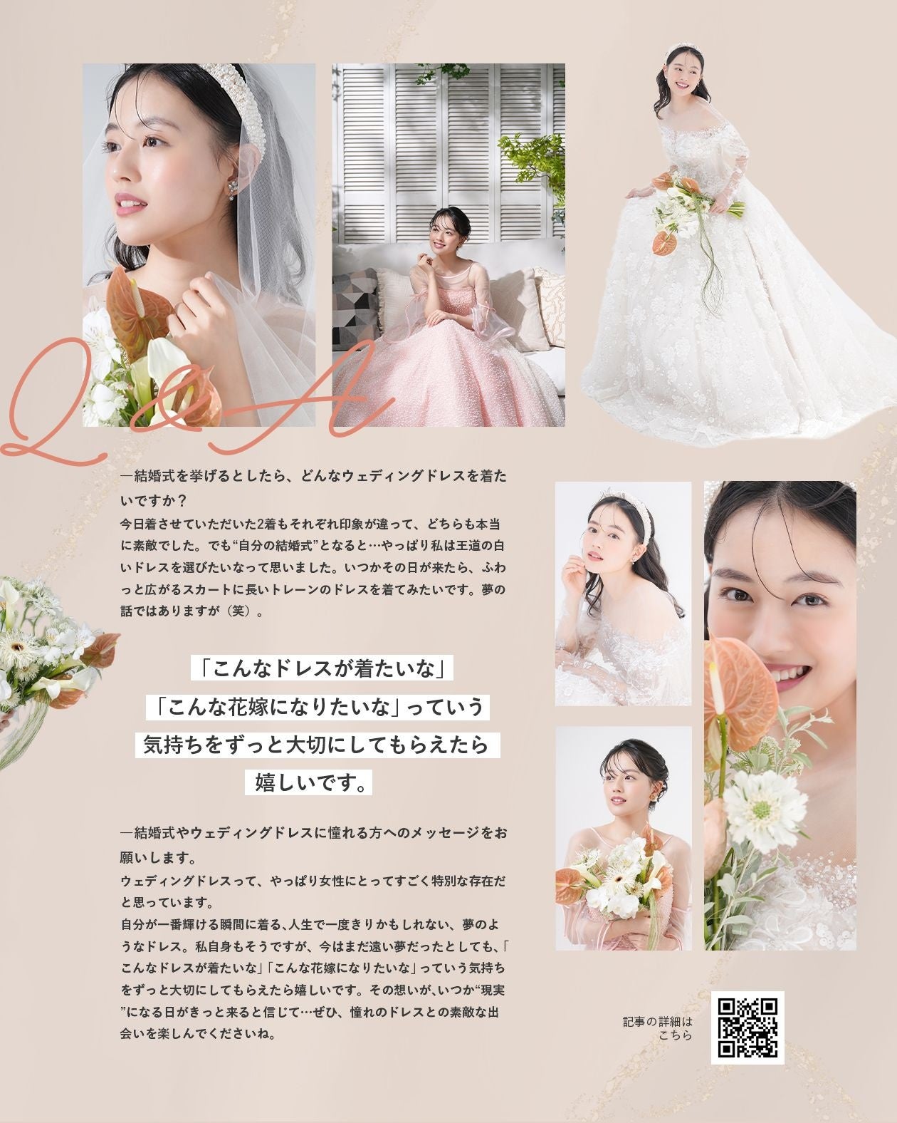 ウェディングドレスって、やっぱり女性にとってすごく特別な存在だと思っています。自分が一番輝ける瞬間に着る、人生で一度きりかもしれない、夢のようなドレス。私自身もそうですが、今はまだ遠い夢だったとしても、「こんなドレスが着たいな」「こんな花嫁になりたいな」っていう気持ちをずっと大切にしてもらえたら嬉しいです。その想いが、いつか“現実”になる日がきっと来ると信じて…ぜひ、憧れのドレスとの素敵な出会いを楽しんでくださいね。(インタビューより抜粋)