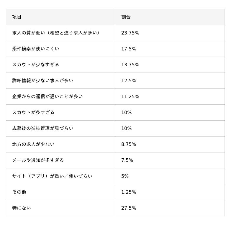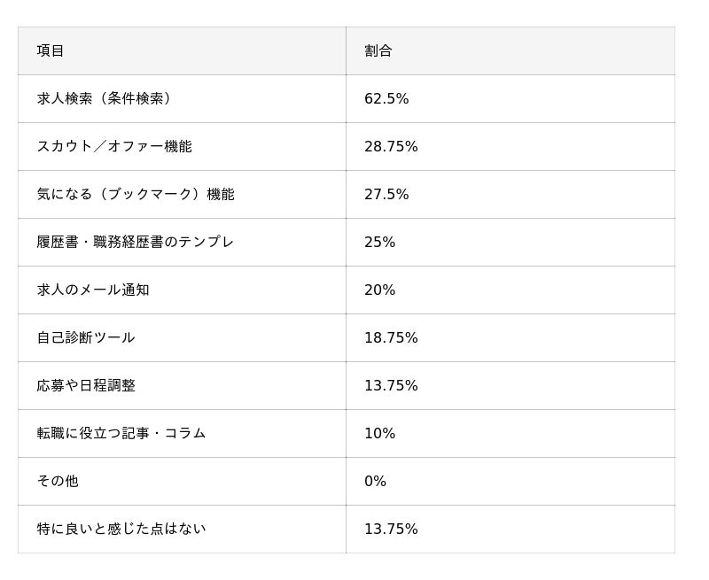 - 転職サイトの良い点としては「求人検索の使いやすさ」が最も支持された一方、改善点では「求人の質」や「検索しづらさ」が挙げられ、情報の精度や検索体験に対するニーズが高いことが明らかになりました。