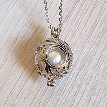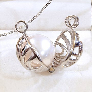 真珠本体に穴を開けずにアクセサリーとして身につけたいという声に基づいて考案したかごペンダント(オリジナルのペンダントヘッドとチェーン)です。「虹の守珠」は、大粒の真珠(約10mm)であるため、市販のかごペンダントには入らないことが多いことから、〈虹の守珠〉専用の、波をモチーフにした真珠葬オリジナルかごペンダントをご用意しました。