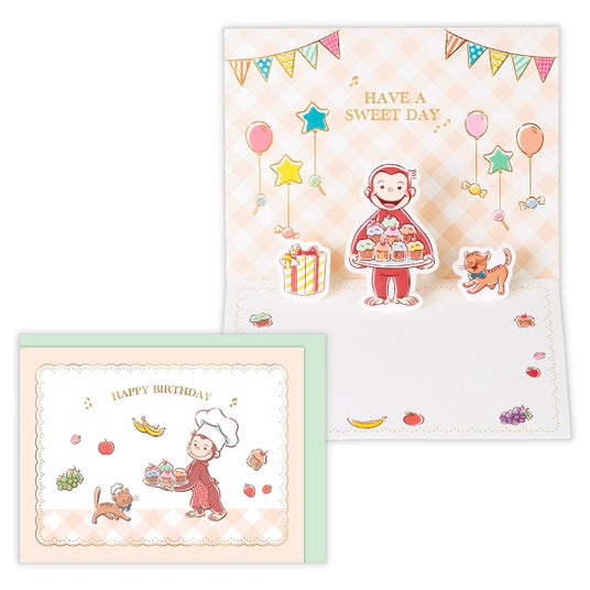 カラフルなカップケーキと一緒にジョージが誕生日をお祝いしてくれているようなデザインです。日本向けに特別に描き起こされた「おさるのジョージ」のアートワークがポイント。お子さま向けはもちろん大人同士のやりとりにも使いやすいデザインです。