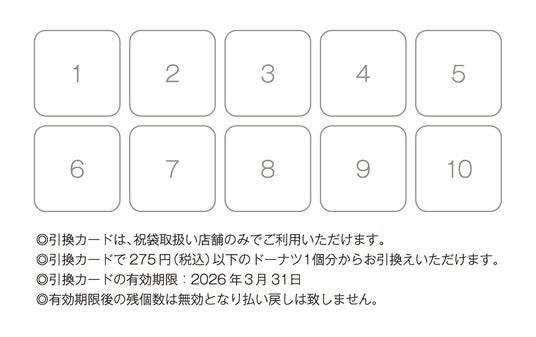 ドーナツ10個引換券(表) ご購入いただいた日から引換期限の2026年3月31日まで、店舗で引き換えいただけます。