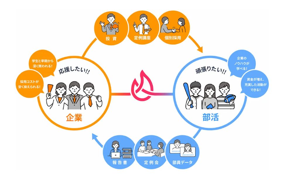 「SPONSORS BOOST」は、企業が応援したい部活に対して小口支援することで、企業が部活の学生と早期接点が持つことが出来、採用にも活用できるサービスです。