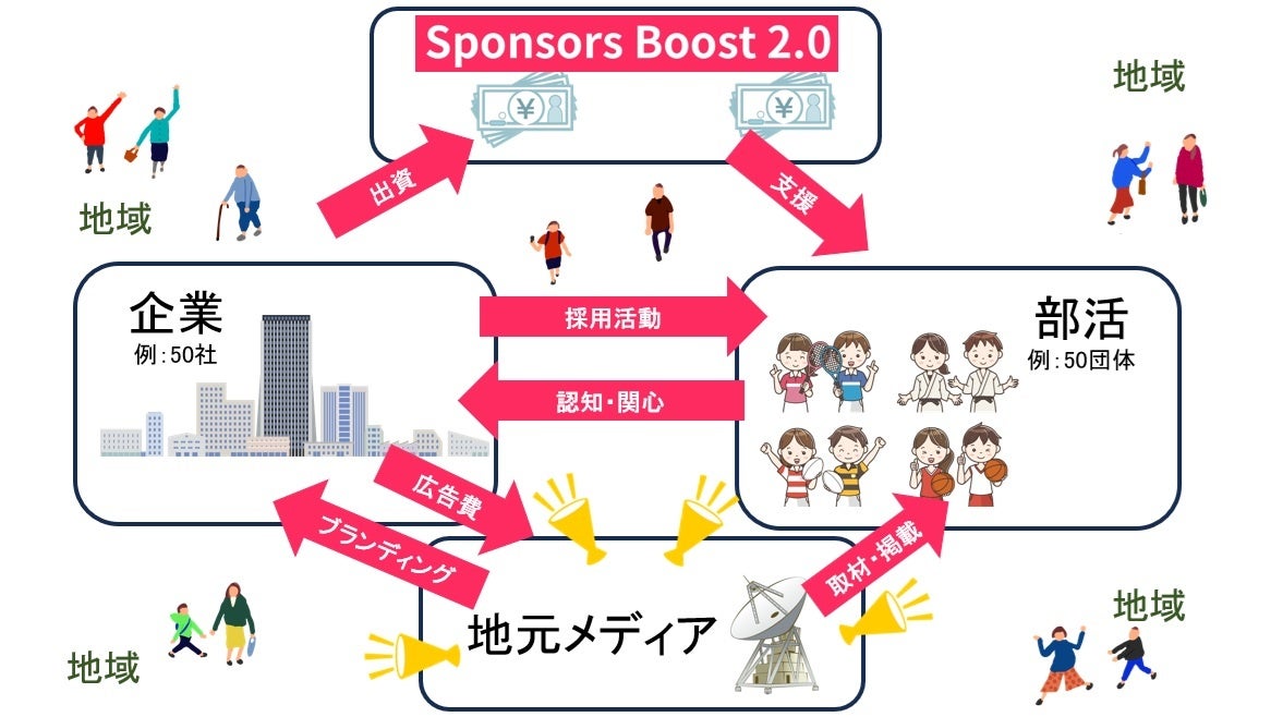 今回スタートする「SPONSORS BOOST 2.0」 は、地元企業が集まって、地元の部活や学生を支援することで、学生の活動が広がるだけでなく、その企業の名前や事業内容は、学生だけでなく、彼らの家族や大学、地域に浸透していきます。