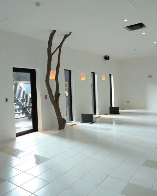 白を基調としたタイルのスタジオには、自然の枝をそのまま生かした象徴的なオブジェが佇み、静かに呼吸を深めたくなるような、落ち着いた空気が流れています。