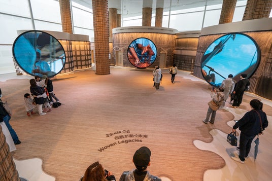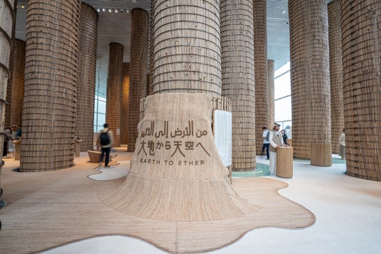 UAEパビリオンは Earth to Ether Design Collective によって設計され、会期を通して建築・クラフト・ストーリーテリングを有機的に結びつけました。デザインの着想源となったのはナツメヤシの木で、最大高さ16メートルに及ぶ「ナツメヤシの葉軸(ラキス)」を使用した90本の柱が、パビリオン内部に木陰を作り出し、オアシスにたたずむような静けさと温もりを来場者に提供しました。この空間デザインは、パビリオンのテーマである「大地から天空へ(Earth to Ether)」を象徴し、UAEが深い伝統に根ざしながら未来へ向けて歩みを進める姿を体現しています。