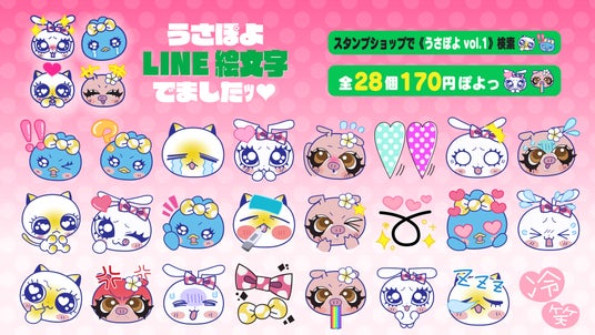 「うさぽよ」は前回LINEスタンプを初リリースし、好評を博しました。今回は、キャラクターの豊かな表情を手軽にメッセージに添えられる“LINE絵文字”として、満を持しての初登場となります。本絵文字は、「うさぽよ」「ぶたたん」「ぺんたむ」「ねこぴ」の4人の豊かな表情やアイコンをモチーフにした全28種類で構成されています。文字の前後や単独で使えるデザインで、トーク画面をよりカラフルで楽しく彩ります。