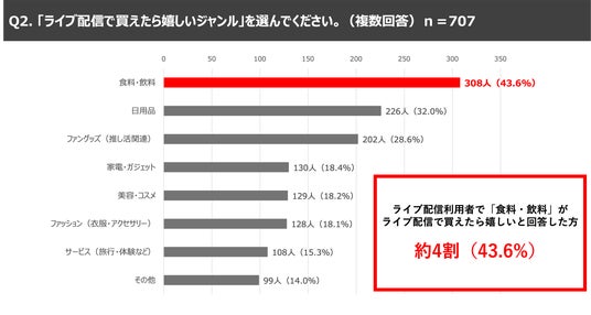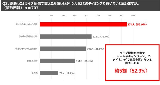 全ての対象者に、ライブ配信で買えたら嬉しいジャンルに関する質問をしたところ、約4割(43.6%)の方が「食品・飲料」を購入したいと回答し、さらにどのタイミングで購入したいかの質問では、半数以上(52.9%)の方が「セールやキャンペーンの時」と回答。国内の食料品高騰や物価高の影響からか、ライブ配信においても食料品をお得なタイミングで購入したいと考えている方が多いことが分かりました。