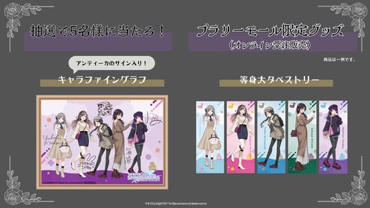 本企画では、参加者がおでかけエンタメアプリ「プラリー」を使って名古屋のまちを周遊しながら、対象スポットにチェックインし、地域経済の発展や地域活性化を促すという要素に加え、アイドルユニット「アンティーカ」5名によるオリジナルのバックグラウンドストーリー(全10種)をミュージカルが開催される名古屋のまちなかで実際に聴くことができるという、アンティーカたちの実在感を五感で感じられるような施策となっています。ジオフラは「移動の中に発見と感動をつくる」という取り組みを各地で行っていますが、今回も現地に行って、まちを周遊し、そこでしか得ることができない経験や価値を得るという、移動にまつわる新たな価値を創造していくことを目指します。撮り下ろしビジュアルを用いたオリジナルグッズ
