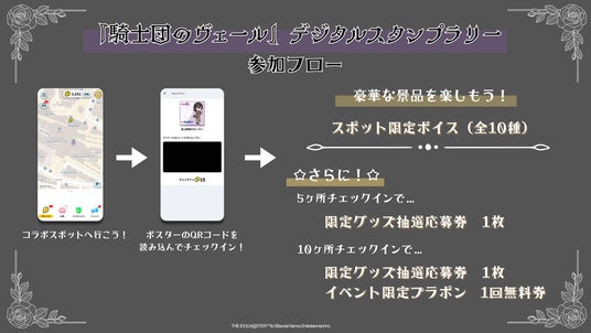 デジタルスタンプラリー全10か所をコンプリートすると、特典としてカプセルトイ「プラポン」を1回無料で引くことができるチケットが付与されます。「プラポン」の景品には、全125種類(※封入されているプチカ5枚の組み合わせは計25パターン)のオリジナルイラストを用いたトレーディングカードをご用意しています。またジオフラが運営するオンラインECサイト「プラリーモール」では撮り下ろしビジュアルを使用したオリジナルグッズの受注販売も実施します。『騎士団のヴェール デジタルスタンプラリー』イベント概要