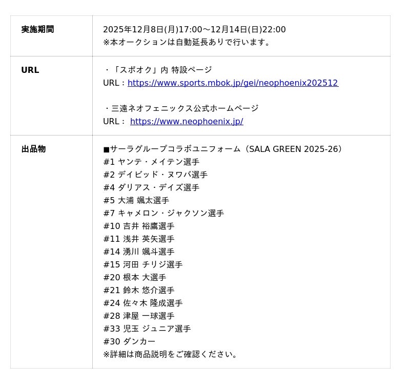 株式会社モバオク(本社:東京都渋谷区、代表取締役社長:小一原 宏樹、以下モバオク)がエンゲート株式会社(本社:東京都中央区、代表取締役:城戸 幸一郎、以下エンゲート)と業務提携し提供するスポーツチーム公式オークションサービス「スポオク」にて、B.LEAGUE所属の三遠ネオフェニックスが実施する『サーラグループ コラボユニフォーム(SALA GREEN 2025-26) チャリティーオークション』を2025年12月8日(月)から開始します。