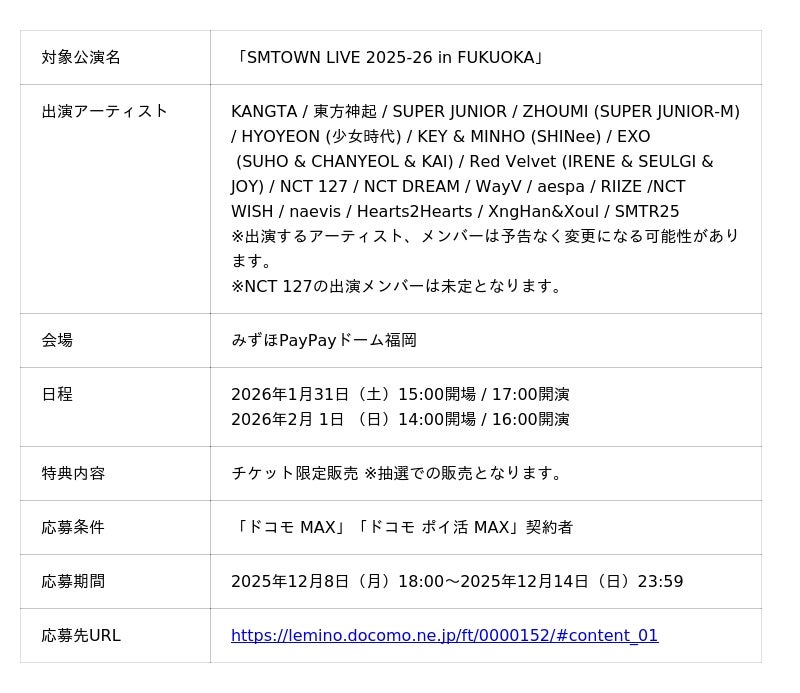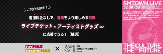 これらの取り組みは、ドコモが「ドコモ MAX」「ドコモ ポイ活 MAX」のお客さま向けに提供する「特別な体験価値」特典の 1つです。今回のライブチケットの限定販売やプレゼントといった取り組みに加え、SM ENTERTAINMENT JAPAN所属アーティストのグッズプレゼント、映像コンテンツの配信など、今後の取り組みは順次発表予定です。