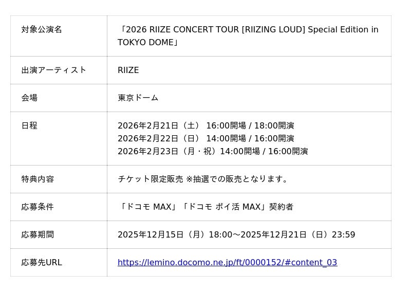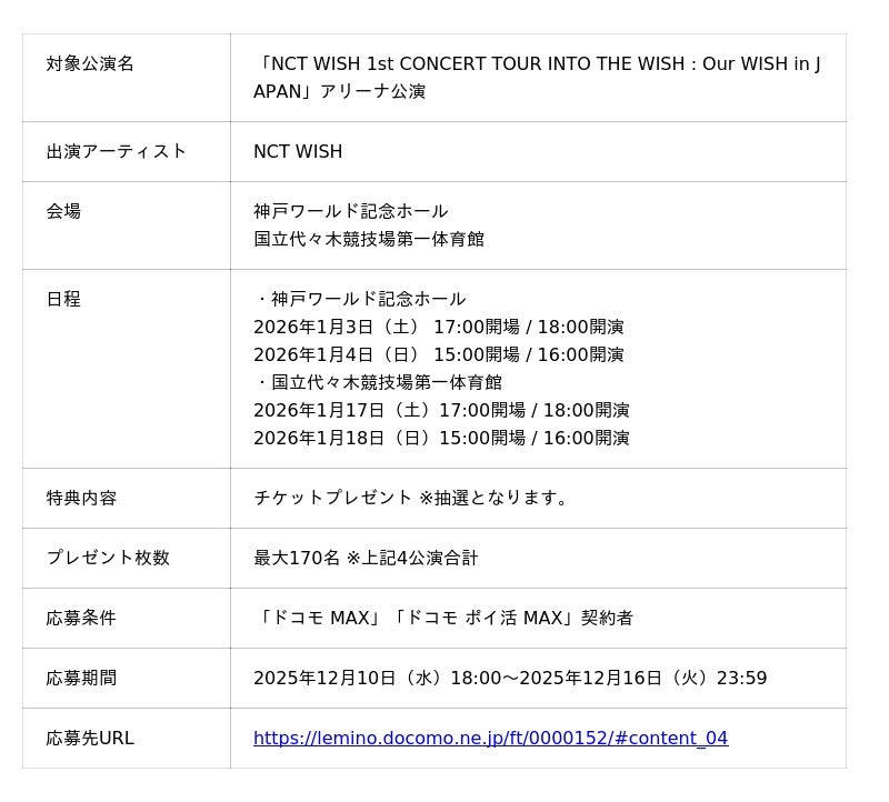 株式会社NTTドコモ(以下、ドコモ)は、2025年12月8日(月)から「ドコモ MAX」「ドコモ ポイ活 MAX」を ご契約のお客さま※1※2※3を対象に、「SMTOWN」「RIIZE」といった豪華アーティストのライブイベントチケットの限定販売や、「NCT WISH」のライブチケットの抽選プレゼントを実施します。