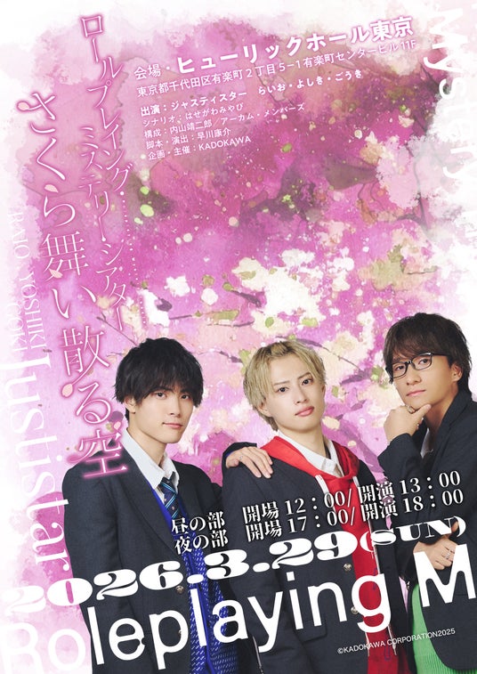 株式会社KADOKAWA(本社:東京都千代田区、取締役 代表執行役社長 CEO:夏野 剛、以下 KADOKAWA)は、2026年3月29日(日)に「ロールプレイング・ミステリー・シアター さくら舞い散る空/わたしの輝ける星」を、ヒューリックホール東京にて実施することをお知らせいたします。
