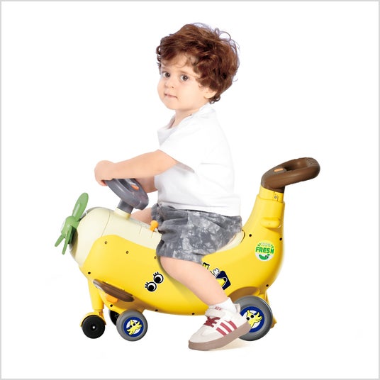 子どもたちに人気のバナナと飛行機を掛け合わせた、キャッチーなデザインの室内乗用玩具。成長に合わせて4つのモードで遊べます。10種類の賑やかな音楽や、飛行機の離着陸音などのサウンド、くるくると回りながら光るプロペラなど、好奇心をくすぐるしかけがたっぷり!シートの下は収納スペースがあり、お気に入りのおもちゃやぬいぐるみを持ち運ぶことも可能です。