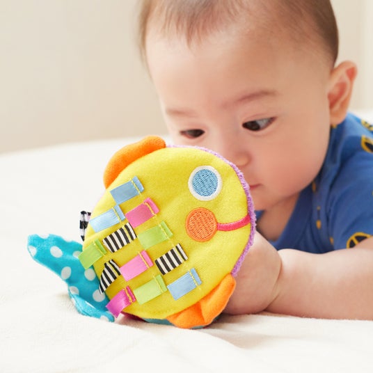 累計160万部突破※!「Sassyのあかちゃんえほん」シリーズの『ちゃぷちゃぷ』に登場するにっこり笑顔のおさかなのキャラクターがモチーフ。うろこや海藻に見立てて、お子さまの好きなつるつるの質感のリボンがたくさん使用されています。音や様々な触り心地を楽しみながら、海の中をテーマにお話を作って遊びましょう。お出かけ時に便利なループ付きです。※2025年11月時点