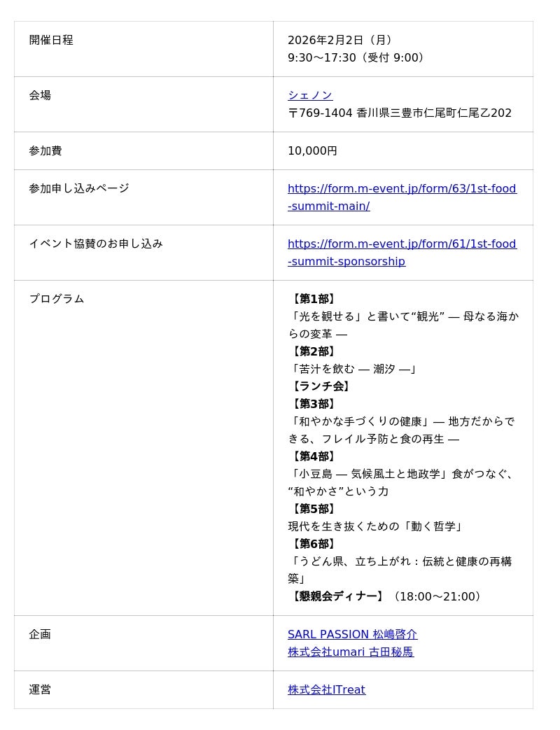日本を代表するフレンチシェフ・松嶋啓介氏が毎年主催する「食サミット(食べると書いて食サミット)」が、2026年2月2日(月)、香川県三豊町にて開催されます。