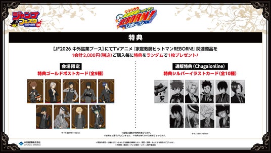 中外鉱業ブースにてTVアニメ『家庭教師ヒットマンREBORN!』JF2026関連商品を1会計2,000円(税込)ご購入毎に、特典ゴールドポストカード(全9種)をランダムで1枚お渡しいたします!
