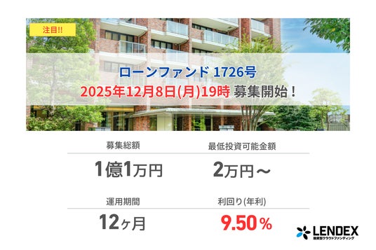 この度、融資型クラウドファンディング「レンデックス(LENDEX)」を運営する株式会社LENDEX(本社:東京都渋谷区、代表取締役:中村 智)は、年利9.5%のローンファンド1726号を本日、2025年12月8日の19時に募集開始することをお知らせします。