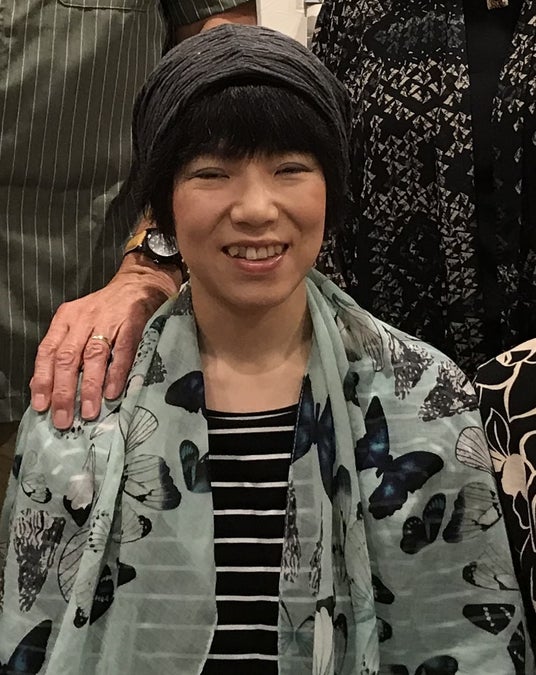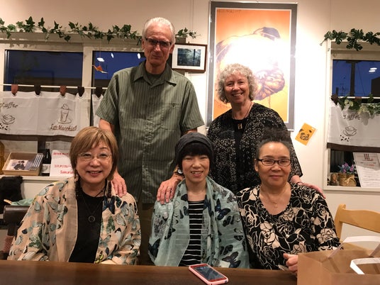 2019年に来日された際に函館市を訪れた著者のウィリアム・ヒューワード先生、奥様のジル・ダーディグ先生(上)田中桜子、たむらあやこさん、たむらさんのお母様(下左から)グリーンフォーレストカフェにて