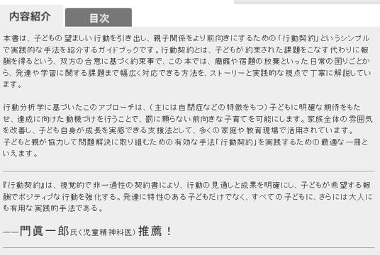 行動契約とは、子ども(や大人)が約束された課題をこなす代わりに報酬を得るという、双方の合意に基づく約束事で、この本では、癇癪や宿題の放棄といった日常の困りごとから、発達や学習に関する課題まで幅広く対応できる方法を、ストーリーと実践的な視点で丁寧に解説しています。