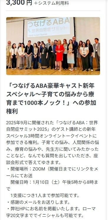 2026年1月10日オンラインイベント「つなげるABA豪華キャスト新年スペシャル~子育ての悩みから療育まで1000本ノック!」Readyforのクラウドファンディングのリターンの一つとして行うワクワク企画。講演会で見る著名な先生がたとの素顔でのオンライントークイベントです。「つなげるABA世界自閉症サミット」