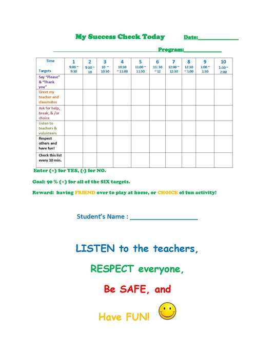 当時、ABAをマサチューセッツ大学のオンラインコースで学んでいた私は、「随伴性契約」という教育法(自己管理法)を知り、息子の自立を助けるために「My Success Check Today(今日のやったぞ!チェックカード)」自己管理プログラムを作成しました。