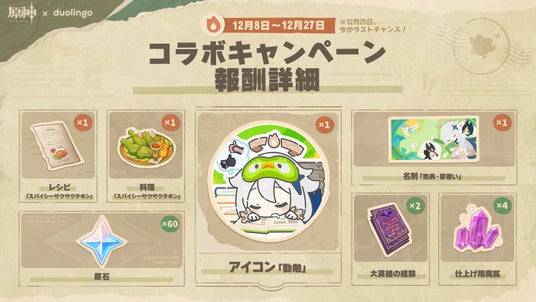 クエストを達成すると、『原神』特別報酬としてアイコン「勤勉」、名刺「祭典・夢習い」、そしてスメール風の特別料理「スパイシーサクサクチキン」とそのレシピが贈られます。報酬の交換コードの受取期限は2025年12月30日23:59:59(UTC)までとなり、Duolingoの「ショップ」にて受け取ることができます。交換コード受取後、『原神』での交換期限は2026年1月31日15:59:59(UTC)までとなります。