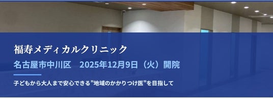 2025年12月9日(火)、名古屋市中川区に「福寿メディカルクリニック」(院長:竹田 直也)が開院します。本クリニックは、地域の皆さまの健康維持と子どもたちの成長を支える医療を提供してまいります。