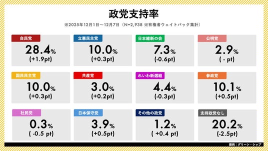 ジャッグジャパン株式会社(本社:東京都渋谷区)は、株式会社グリーン・シップ(本社:東京都千代田区)と業務提携し、グリーン・シップが提供する日次世論調査「世論レーダー」のデータを提供しております。本日、2025年12月第1週(12月1日~7日)の内閣支持率・政党支持率調査の結果を発表いたします。また、詳細レポートPDFを「世論レーダー」公式サイトの週次ページで1,980円(税込)で販売開始しました。