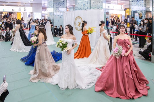 福岡 麻生外語観光&ブライダル専門学校、JR九州博多駅、レイジーシンデレラ福岡の3者が協働し、「いい夫婦の日」である11/22(土)に、博多駅でウェディングファッションショーを開催しました。