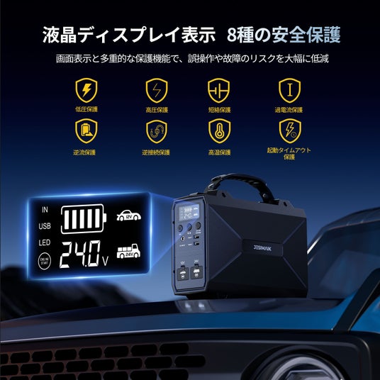さらに42000mAhの大容量を備え、mAhあたりの価格は0.6円未満と非常にコストパフォーマンスに優れています。満充電状態で12V車両を60回以上、24V車両を30回以上始動可能です。