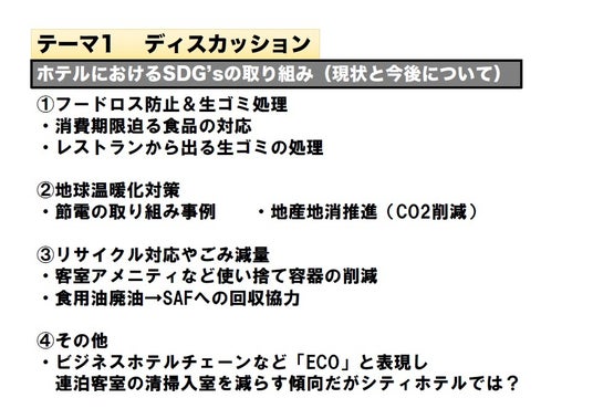 1.ホテルにおけるSDG sの取り組み近年注目を集めている「SDGs」とホテル業界に関連付いている目標の解決のためにできることをディスカッションしました。レストランのフードロス問題や、アメニティなどホテルならではのSDGsの推進について学びました。