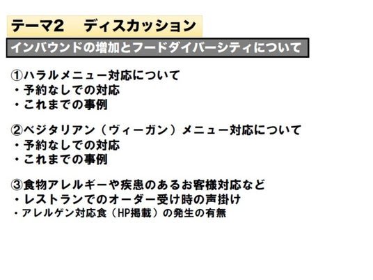 外国人観光客数の増加が続いている日本の観光業界では「フードダイバーシティ」への理解が一層求められます。形式的に食べられるもの・食べられないものを覚えるだけではなく、「なぜ食べられないのか」背景を理解することで、観光客に対する正しい対応を学びました。