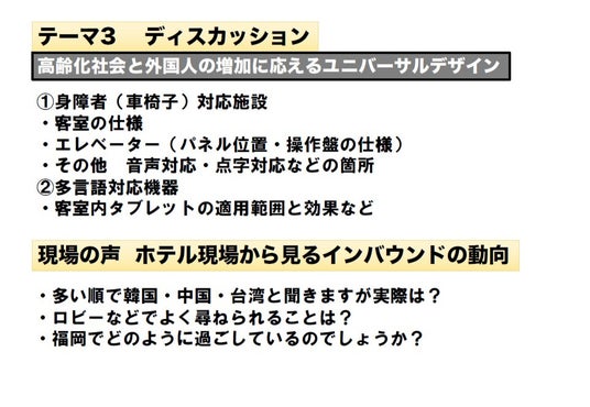 ホテル業界において、「身障者(目や耳が不自由・言語障害・車椅子利用)」や「外国人」に対してサービスを提供する機会があります。「すべての人が快適に使えるデザイン」と「すべての人のお役に立つサービス」の実現に必要なことは何かについてディスカッションをしました。
