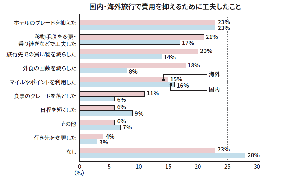 費用を抑える工夫では、国内・海外ともに「ホテルのグレードを抑えた」が23%で最も多い一方で、国内・海外で費用の抑えかたに違いがみられる結果に。