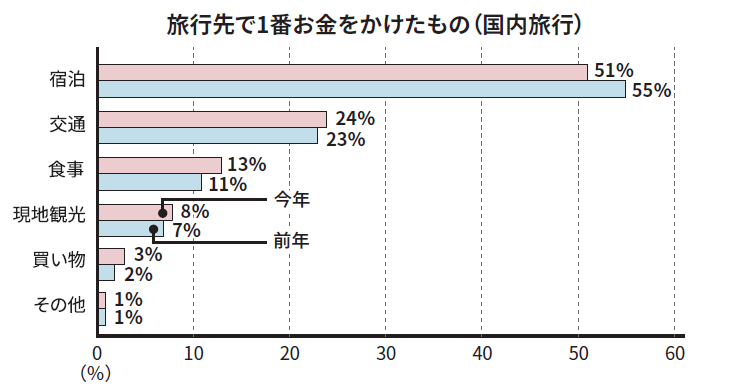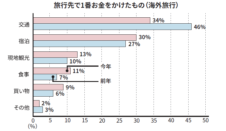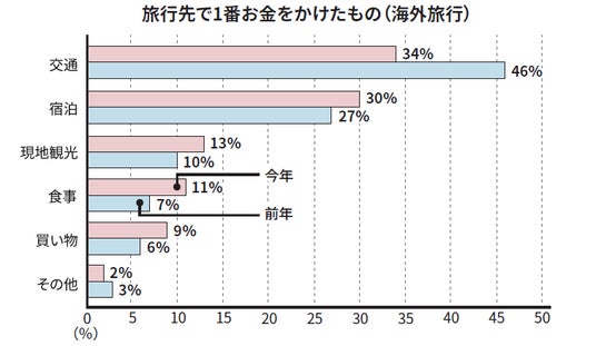 旅行で最も費用をかけた項目は、昨年同様、国内では「宿泊」、海外では「交通」が最多。