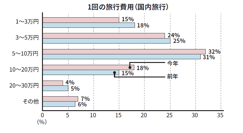 国内旅行費用は、昨年と同様「5~ 10万円」が最多の32% 。海外旅行は、「30~ 100万円」が40%を占め、依然として高額帯の回答が多い結果に。