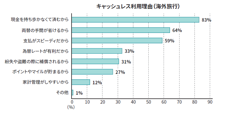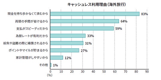 海外旅行先でのキャッシュレス決済の利用は、9割以上にのぼり、国内旅行でも同様の結果となりました。決済手段としては、デビットカードとクレジットカードをメインで利用されたかたが多い結果となりました。海外旅行でキャッシュレス決済を利用した主な理由は、「現金を持ち歩かなくて済むから」が最多となり、安全性に加え、利便性を重視する傾向がうかがえます。