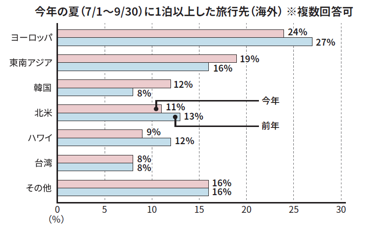 今年の夏に国内旅行をされたかたは81% 、海外旅行は39%に。海外の渡航先はヨーロッパ、北米、ハワイが減少した一方、アジア圏が昨年の32%から39%へ増加し、近距離の渡航先が増加傾向に。