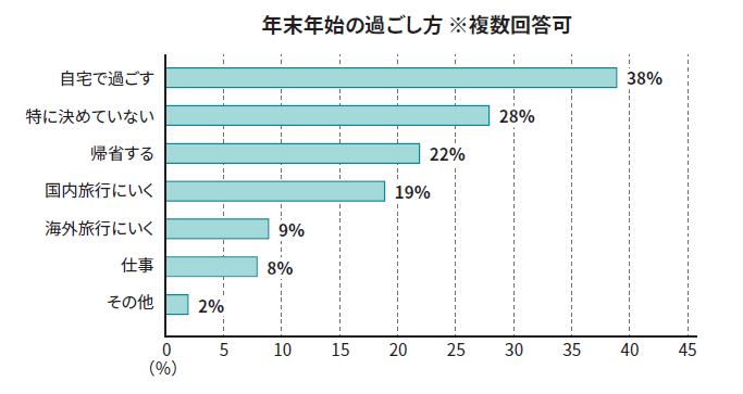 年末年始の過ごし方については、「自宅で過ごす」と回答したかたが38%で最多となり、自宅で年末年始を過ごす予定のかたが多いことがうかがえます。