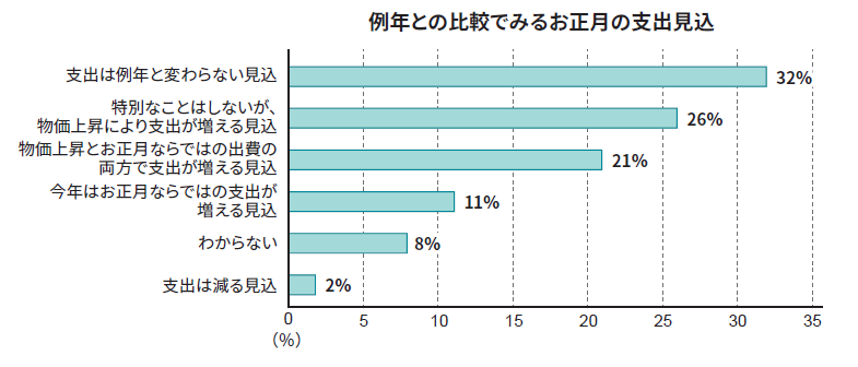 年末年始の支出見込みについては、「夏休み期間より少ない」と回答されたかたが41%と最も多く、年末年始は夏休み期間と比較して控えめな消費になると考えるかたが多いようです。一方で、物価上昇などの影響を受け、例年よりは「支出が増える」というかたも約半数おり、物価上昇による変化が年末年始の消費行動にも影響すると予想されます。