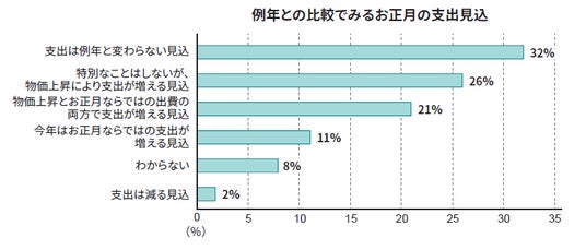 年末年始の過ごし方は、「自宅で過ごす」が最多。年末年始の支出は「夏休み期間より少ない」と見込むかたが約4割いる一方で、例年より「支出が増える」と予想する声は半数以上に。