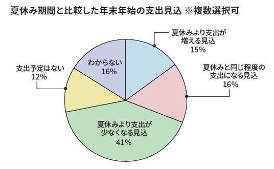 ・年末年始の過ごし方は、「自宅で過ごす」が最多。年末年始の支出は「夏休み期間より少ない」と見込むかたが約4割いる一方で、例年より「支出が増える」と予想する声は半数以上に。