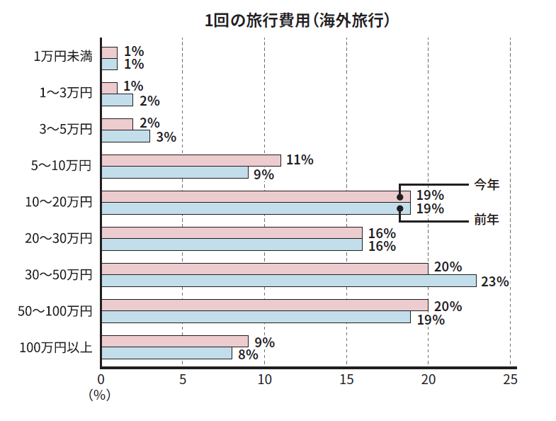1回あたりの国内旅行費用は「5~ 10万円」が昨年と同様に最も多くなりました。海外旅行では「30~ 100万円」と回答したかたが40%を占めた一方で、「5~ 10万円」が昨年比2ポイント増加の11% 、「10~ 20万円」が19%と、比較的抑えた価格のかたも一定数いました。アジア圏など近距離の海外旅行が増加したことが影響していると考えられます。背景には、移動距離の短縮や物価高を踏まえた旅行スタイルの見直しにあると考えられ、コストを抑えた旅行を選ぶ動きが広がっていることがうかがえます。