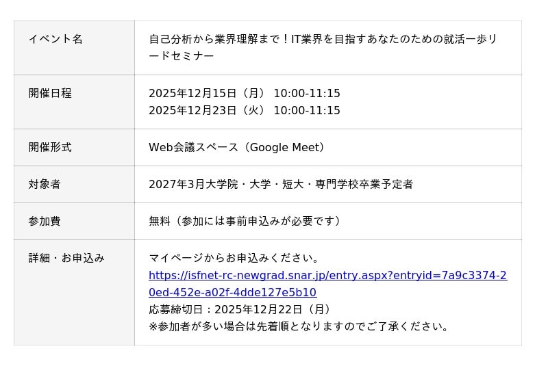 株式会社アイエスエフネット(本社:東京都港区/代表取締役:渡邉幸義、以下アイエスエフネット)は、2027年に卒業を予定する学生を対象に、「自己分析から業界理解まで!IT業界を目指すあなたのための就活一歩リードセミナー」を開催いたします。本イベントは、文理問わずIT業界を目指す学生が、業界への理解や就職活動に役立つ情報を得られるイベントとなり、12月15日と12月23日に開催いたします。