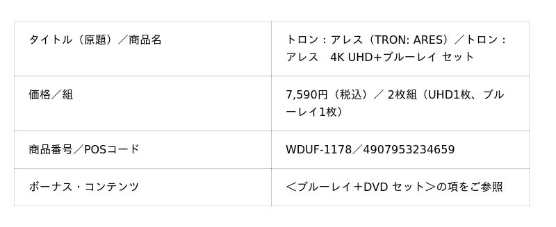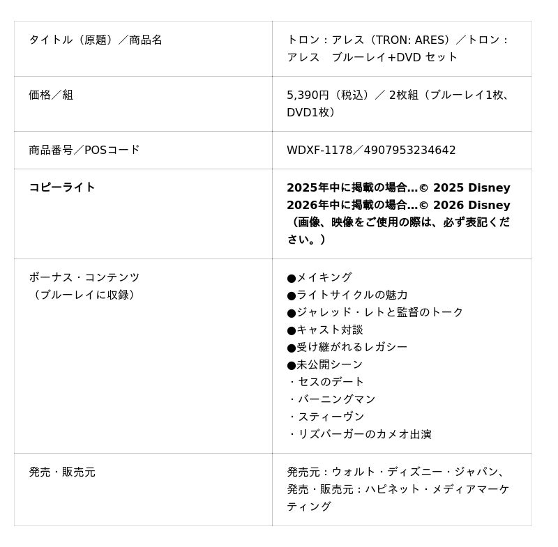 この度発売のブルーレイ+DVDセット、4K UHD+ブルーレイ セット、デジタル配信(購入)には、スタッフのこだわりや撮影現場の熱量が詰まった「メイキング」をはじめ、「ライトサイクルの魅力」、主人公アレスを見事に演じ切った「ジャレッド・レトと監督のトーク」や「キャスト対談」、シリーズに迫る「受け継がれるレガシー」、そして本編には収録されなかった貴重な「未公開シーン」など、ファン必見の豪華ボーナス・コンテンツを多数収録!ディズニーが仕掛ける新映像革命--AI兵士VS人類、究極のデジタル・バトル・アクション『トロン:アレス』を、ぜひブルーレイ+DVDセット、4K UHD+ブルーレイ セット、デジタル配信(購入/レンタル)で、お楽しみください!